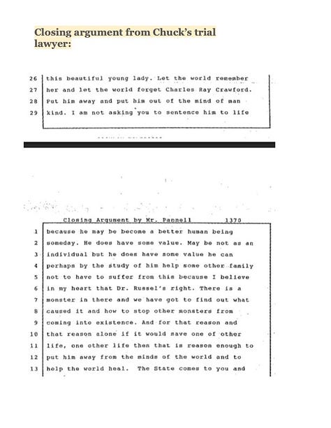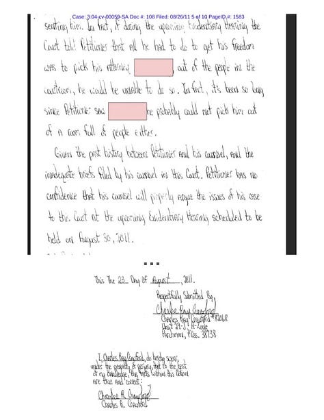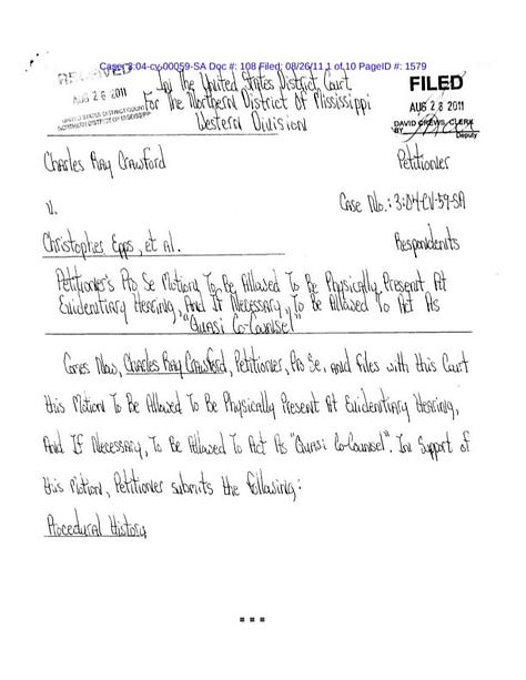 Because my earlier lawyers wouldn’t include a lot of important issues in my filings, the judges can say, “This should have been brought up years ago, now it’s procedurally barred.” Worst of all, the way it’s written, they say “Crawford failed to do this…Crawford failed to do that…” That wasn’t me! That was my lawyers. Just like at my trial, when my lawyers claimed insanity when I opposed it. A judge wrote, “Had Crawford not chosen to go for the insanity defense, his case and conviction would have been overturned;”—but “Crawford” vehemently rejected the insanity defense.