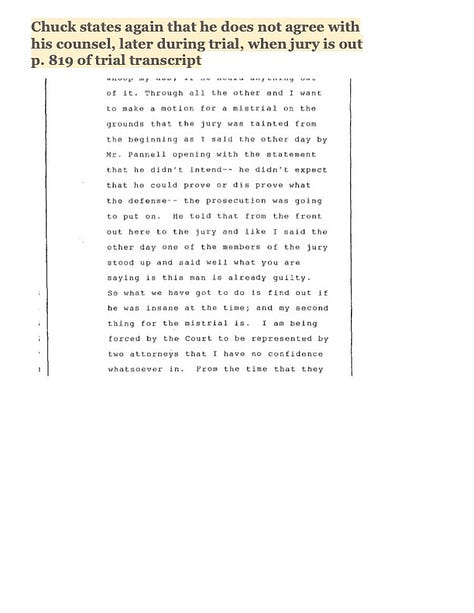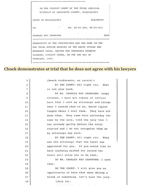 At my trial, my trial attorneys went for an insanity defense. I was adamant that I didn’t want them to do that, and they did it anyway. This meant that my trial lawyer had done no investigation; he focused only on the insanity defense, which works less than 1% of the time. I stood up and objected in trial; I told the judge I no longer accepted my lawyers—as far as I was concerned, they could go sit at the prosecutors’ table because they seemed to be working for them. When the judge said there was nothing he could do, I picked up my chair, took it ten feet away, turned it around, and set my back against the court. You can see my stated disagreement with my trial counsel, as well as the way my attorneys spoke of me, in this excerpt of the trial transcript. If you read page three of that linked excerpt, you would probably swear it was the prosecutor presenting his closing argument, not my attorney.