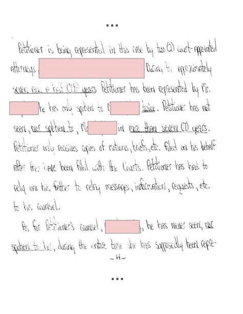 My lawyers disagreed. I received letters from one of them explaining very confidently that they would never come visit me. I filed with the courts; I told the judge, “Your honor, if you had my attorney in here and told me I could walk free if I could pick her out, I couldn’t do it.” I’ve redacted the names of these lawyers here, because it’s not just them who have done this to me; many lawyers do this to many of us on death row. If I had given that federal habeas lawyer $100,000, she would have been down here seeing me, talking to me on the phone. It’s all about the money.